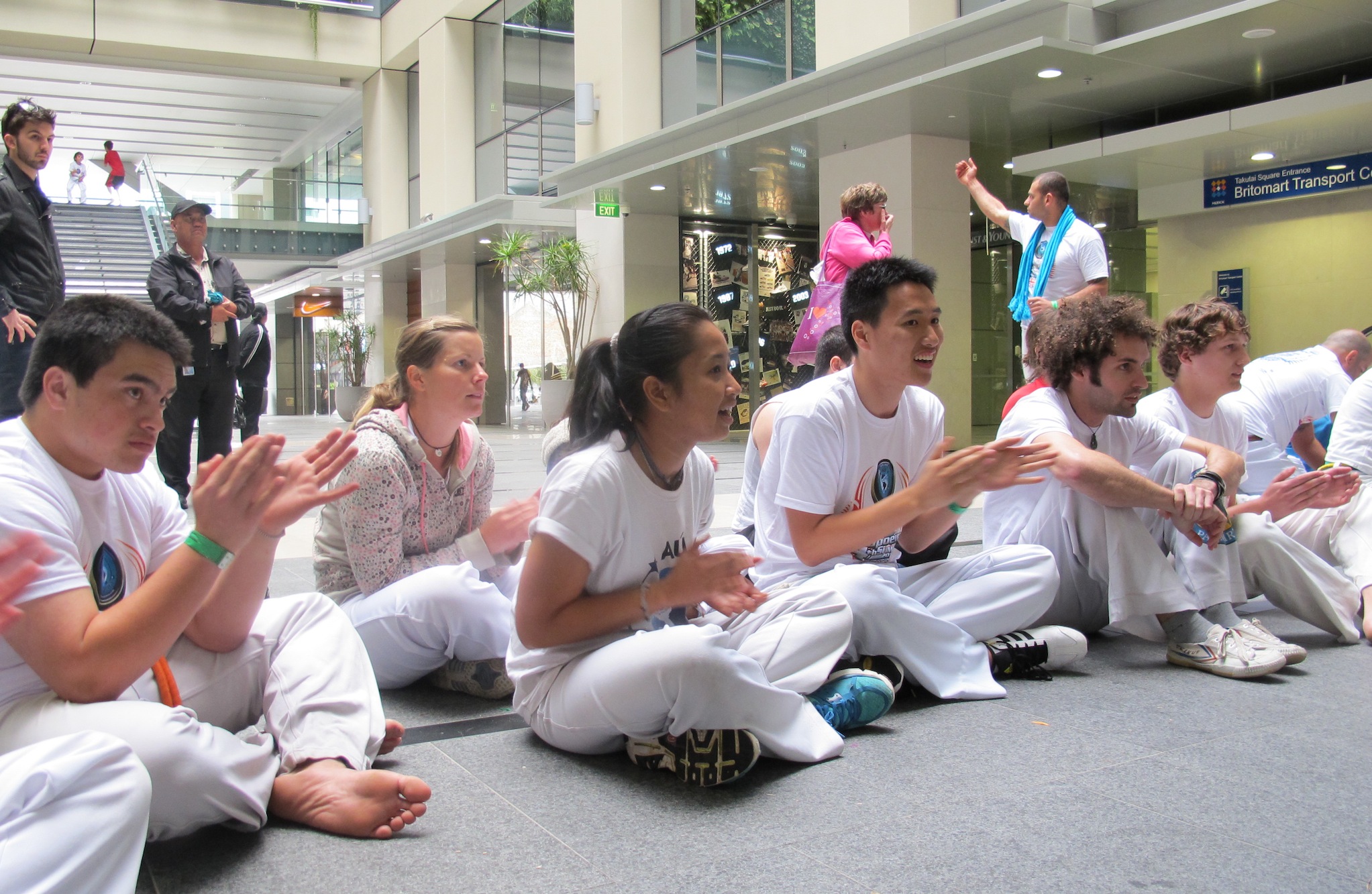 Needless to say when my turn came to step up and get into the game, I was a nervous wreck! I tried to blank my mind out and concentrate just on what I know and have learnt so far, to let the music and my body lead the way. It pretty much passed by in a blur after that. I was faced in the roda by Professor Perere of Aruandê Capoeira NZ, and Instrutor Corvinho of Capoeira Brasil.